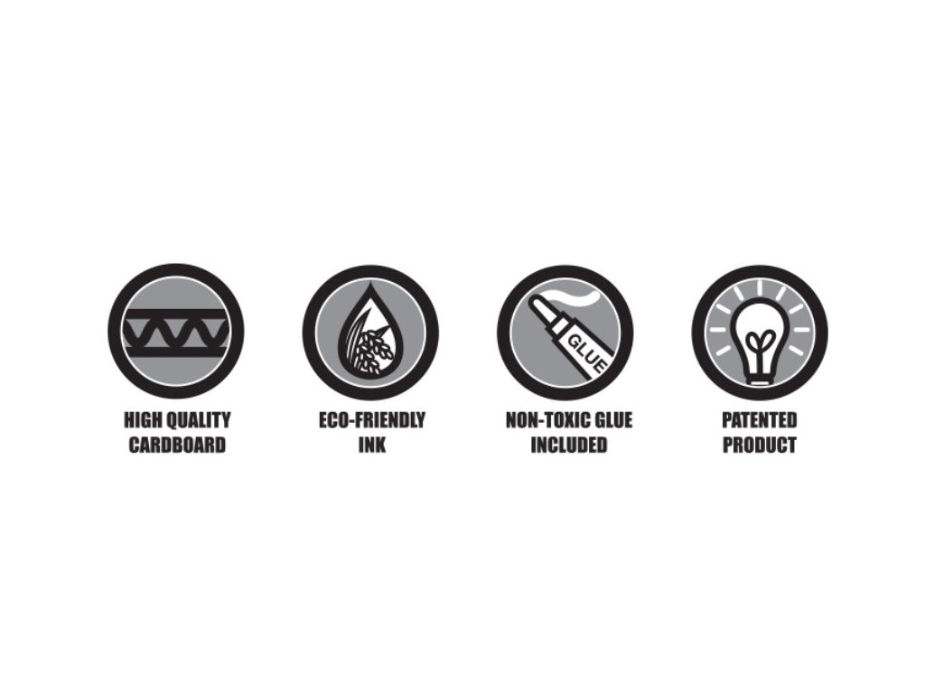 Výrobky odpovídají 100% mezinárodním bezpečnostním normám (EN71-1,2,3 a CPSIA). Balení EUGY obsahuje 6 až 7 plochých karet s individuálně očíslovanými kousky připravenými ke složení. Lepidlo i inkoust jsou netoxické. Vše je maximálně šetrné k životnímu prostředí.